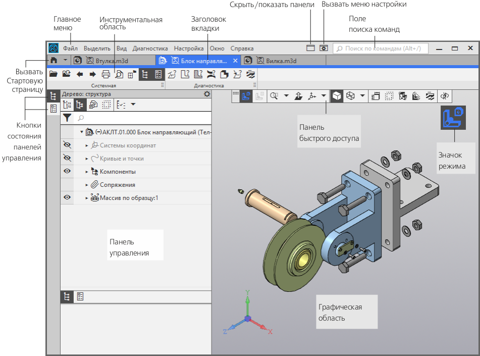 Содержит команды выбора режима, управления изображением и другие. Располагается вверху графической области, может перемещаться по горизонтали. |