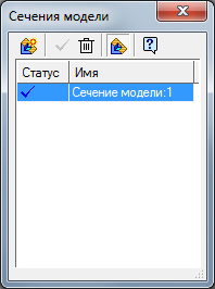 После вызова команды на экране появляется диалог Сечения модели. Диалог содержит список сечений, созданных в модели, и элементы управления сечениями: кнопки создания, изменения, удаления сечения, выбора текущего сечения, включения/отключения режима сечения модели. Подробнее об элементах управления диалога...