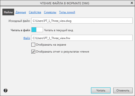 После завершения настройки параметров нажмите кнопку Начать чтение. Для выхода из диалога без чтения файла нажмите кнопку Отмена.