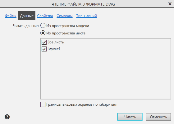 Список позволяет выбрать компоновки для импорта. Включите опции, соответствующие компоновкам, которые должны импортироваться. Список доступен, если выбран вариант импорта Читать данные из пространства листа. |