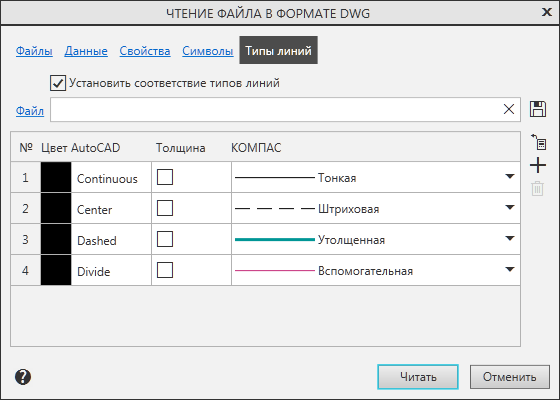 Для подключения созданного или ранее сохраненного файла соответствия типов и стилей линий щелкните мышью по этой ссылке. |