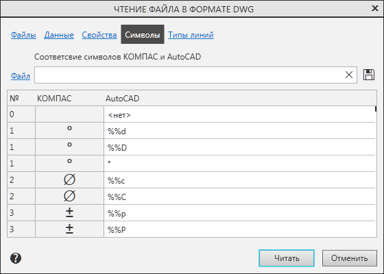 По умолчанию загружается последовательность символов, которая соответствует поставляемому в составе дистрибутива КОМПАС-3D Viewer файлу B_ESKD.SHX. Вы можете интерактивно редактировать соответствие между спецсимволами КОМПАС и последовательностями символов ASCII, которыми они обозначаются в текстовом файле DXF.
