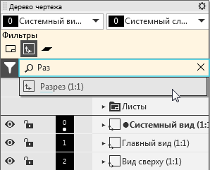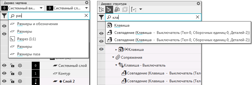 В Дереве графического документа и модели возможен поиск объектов по названию.